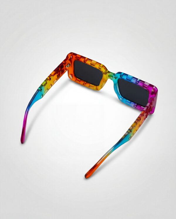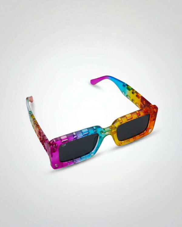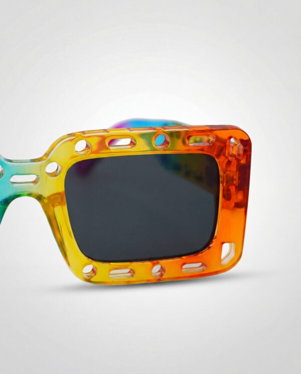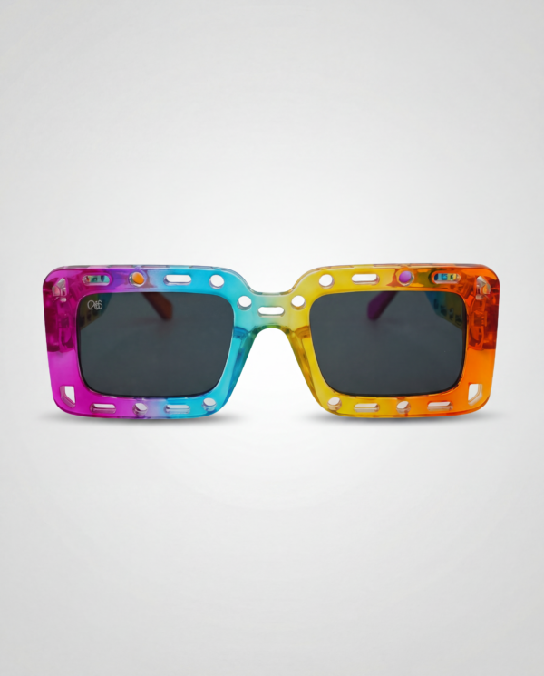 Énergie pure et style maximaliste. Monture rectangulaire multicolore perforée, verres foncés et protection UV400 pour un look festif, bold et totalement unique.